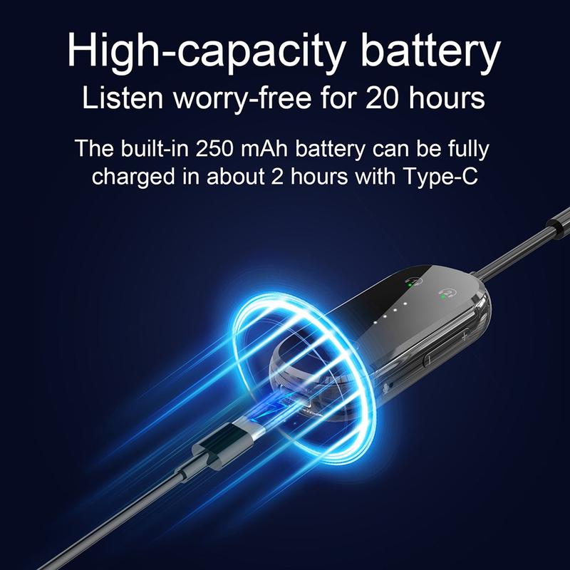 De ingebouwde 250 mAh-batterij zorgt voor een lange gebruiksduur, terwijl het opladen via Type-C het opladen eenvoudig en modern houdt. Deze 2-in-1 Bluetooth-audioadapter is compact en gemakkelijk mee te nemen en is ideaal voor home entertainment, reizen, auto-audio, gebruik op kantoor en het upgraden van oudere geluidsapparatuur zonder deze te vervangen.
