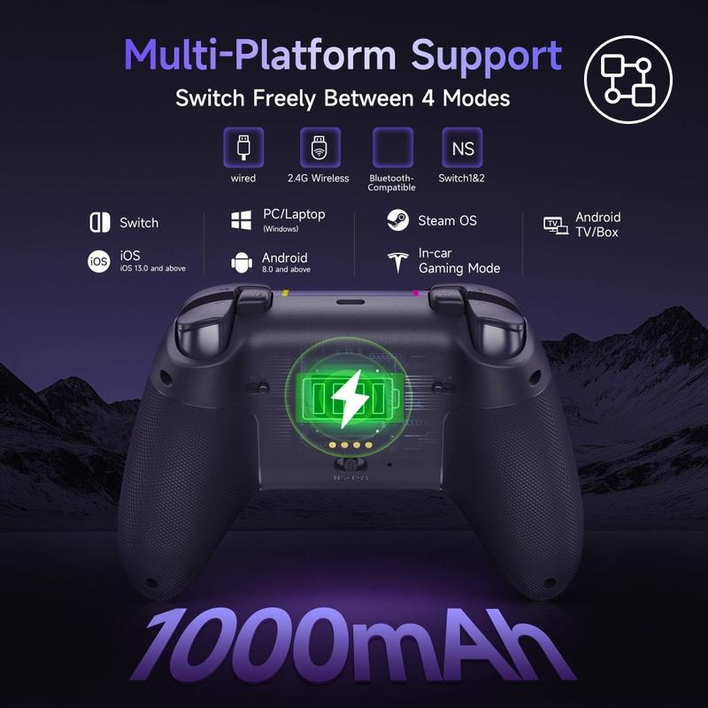 - Drievoudige connectiviteitsmodi - Schakel eenvoudig tussen draadloze 2,4GHz-, Bluetooth-compatibele en bedrade USB-C-modi voor naadloze compatibiliteit met Switch, Windows, Android en iOS.
