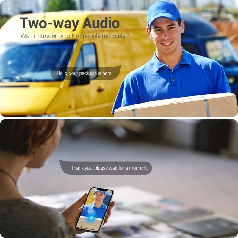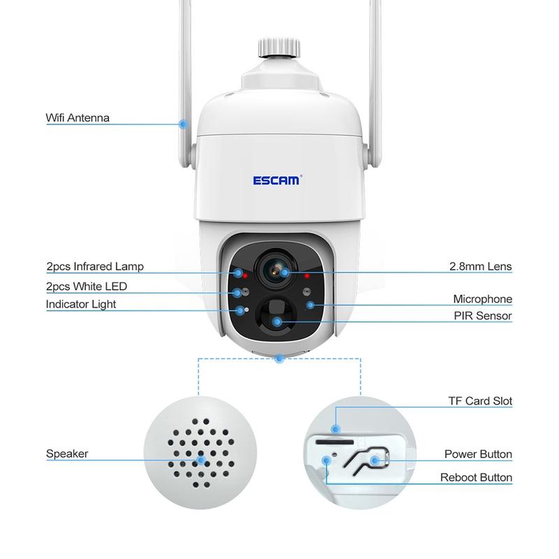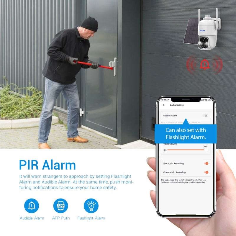 Ondersteunt PIR alarm, APP bericht push, wit licht knipperen en alarmgeluid waarschuwing.