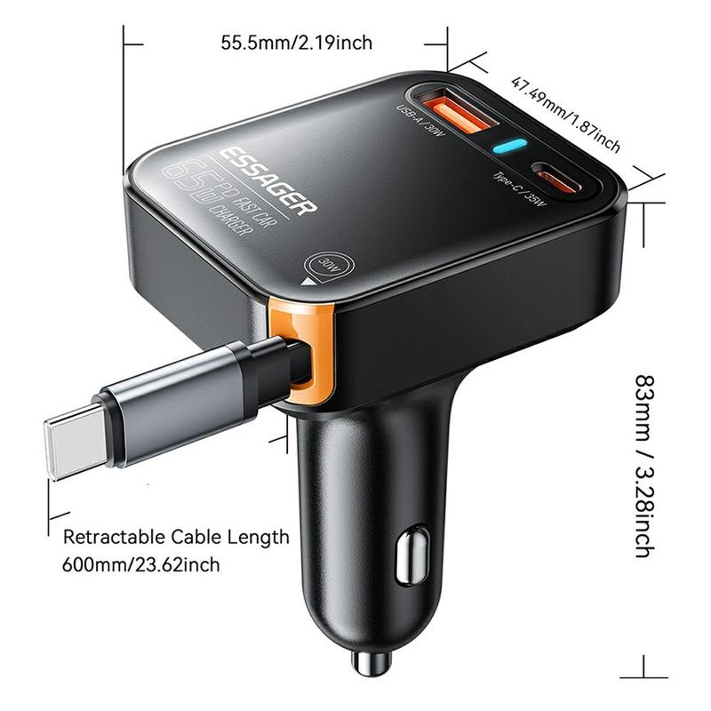 Essager 65W snelle autolader met intrekbare USB-C kabel - USB-A en Type-C poorten, slimme stroomverdeling