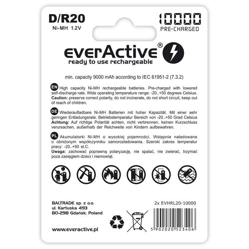 EverActive Professional Line EVHRL20-10000 Ni-MH R20/D oplaadbare batterijen 10000mAh - 2 stuks.
