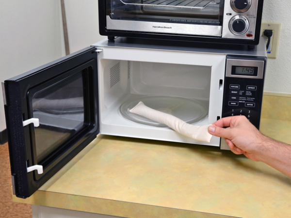 Haal de iOpener uit de magnetron, door deze bij een van de hoeken te houden.
