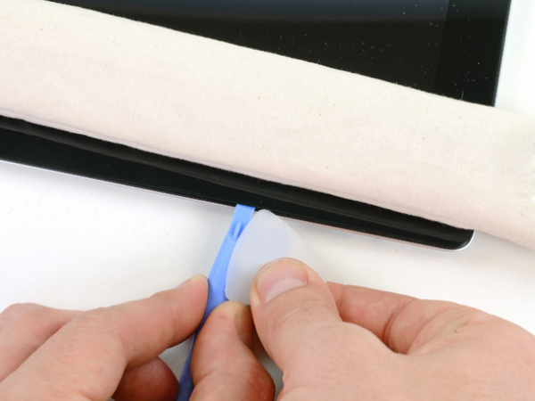 De lijm kan op sommige plekken aan de iPad weer aan elkaar zijn gaan plakken. In dat geval kunt u het plectrum onder de rand van de iPad schuiven waar het glas nog steeds vastzit en dan de lijm voorzichtig snijden.