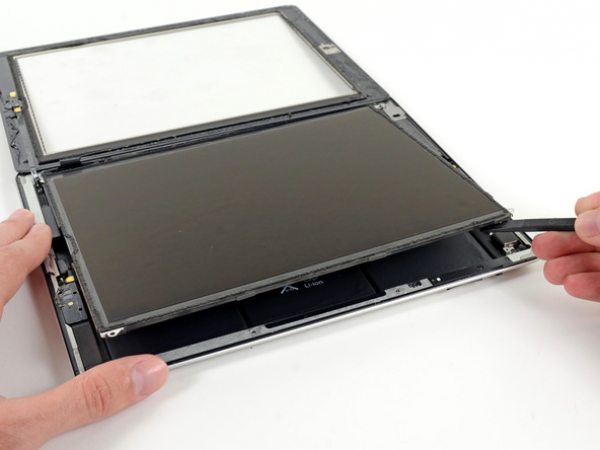 Til de rechterkant van het LCD scherm van de iPad, met behulp van de plastic openingstool of een spudger.