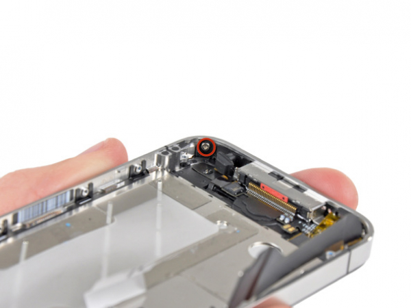 Gebruik een kleine platte schroevendraaier om de 4,8 mm schroef naast de hoofdtelefoonaansluiting te verwijderen.