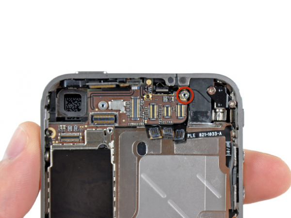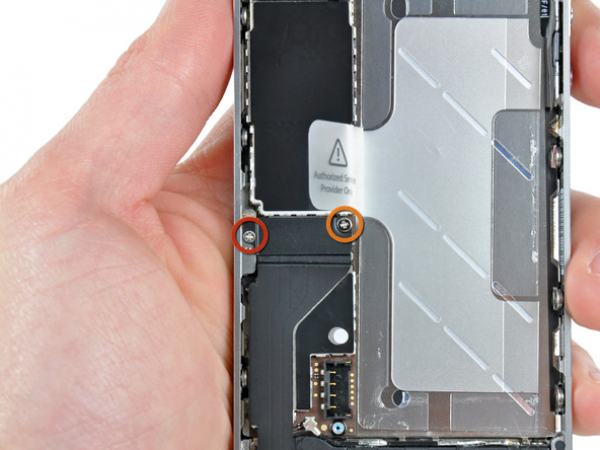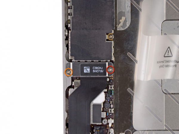 Verwijder de volgende schroeven waarmee het beschermkapje van de dock connector kabel op het logic board vast zit: