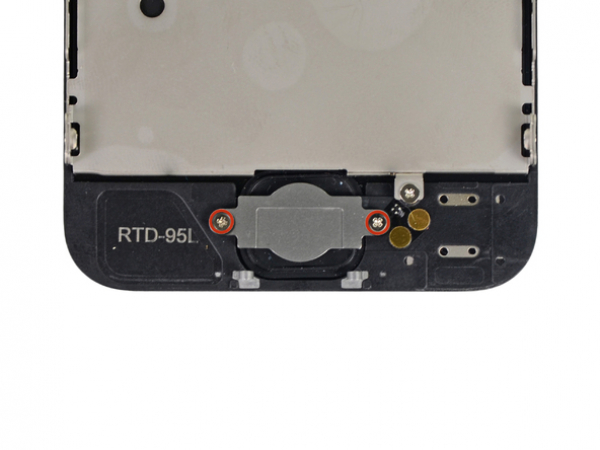 • Verwijder de twee 1,3 mm Phillips schroeven waarmee de home-knop beugel aan het beeldscherm vast zit.