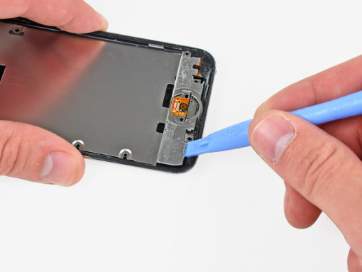 Plaats de rand van een iPod openingstool tussen het glazen frontpaneel en het zwarte plastic frame naast de home-knop.