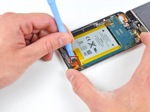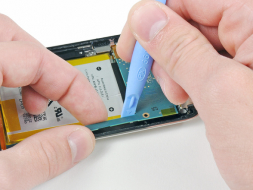 Gebruik de iPod openingstool om de rand van de koptelefoonaansluiting naast de batterij te tillen van de uitsparing.