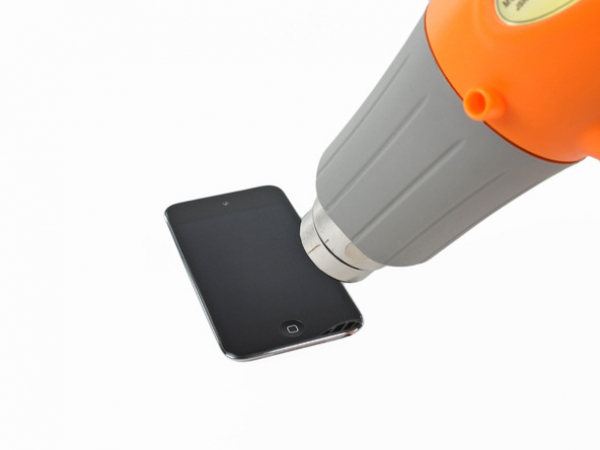 Met het warmtepistool laag ingesteld, kunt u beginnen met het verwarmen van het onderste gedeelte van de Touch bij de home-knop.