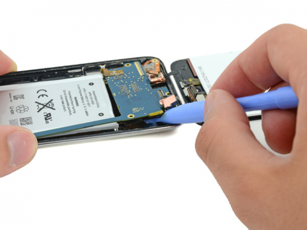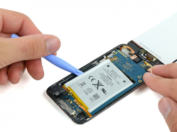 Probeer de batterij niet helemaal uit te halen, maar gewoon losmaken van de lijm.