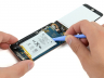 Trek voorzichtig de bovenkant van het frontpaneel weg van de lijm waarmee deze aan de Touch vast zit, ga hierbij voorzichtig om met de korte digitizer kabel waarmee de twee componenten verbonden zijn.