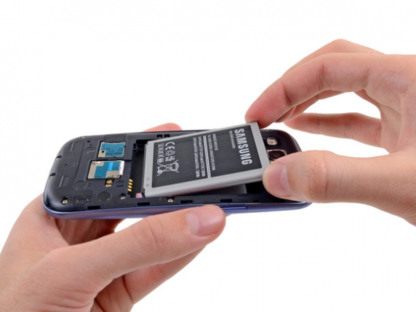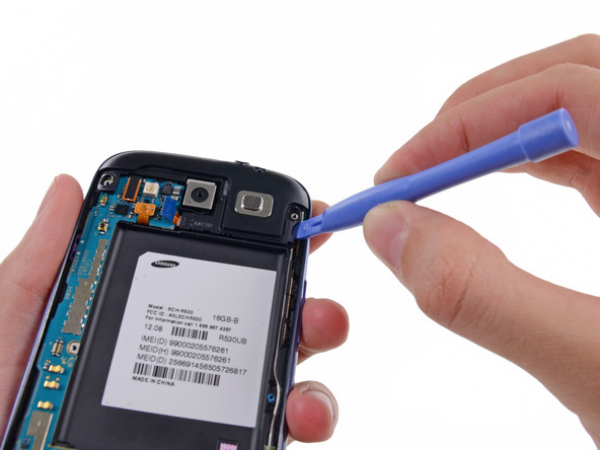 Voeg de plastic openingstool in de uitsparing in de opening tussen de achterkant en de rest van de telefoon aan de bovenkant van het apparaat.