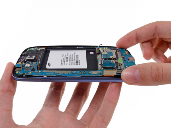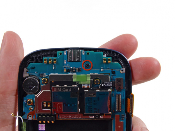 De front camera nog niet verwijderen. De kabel van de camera wordt nog steeds geleid onder het moederbord aan de omgevingslichtsensor.