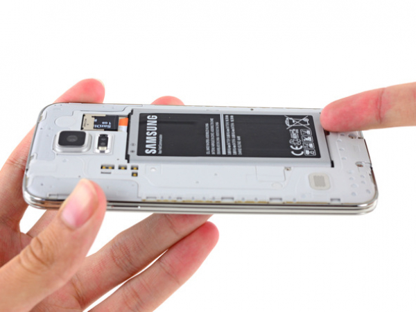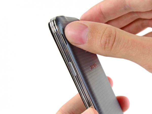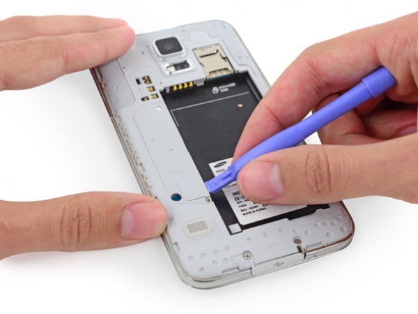 Plaats je nagel of plastic openingstool in de uitsparing in de rechter benedenhoek van de accu en til het omhoog.