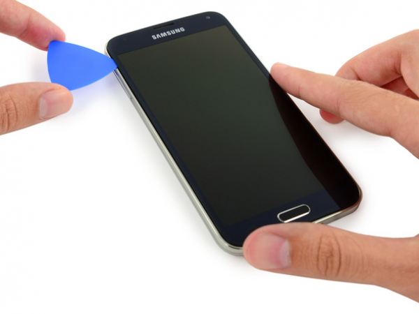 Duw de rand van een plectrum onder de onderste rechterzijde van het front glas.