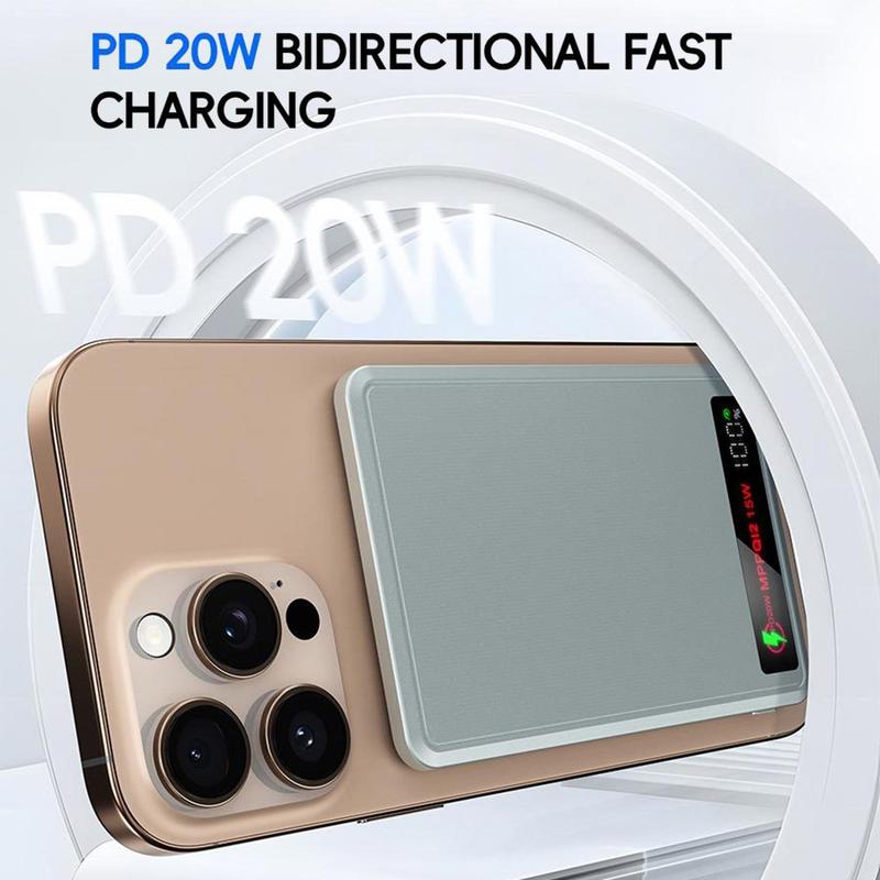 Deze powerbank ondersteunt zowel draadloos als bedraad snel opladen, waardoor u meer flexibiliteit heeft, afhankelijk van uw apparaat en oplaadbehoeften. Hij biedt tot 15 W draadloos opladen via QI-compatibele modi en tot 20 W bedraad PD-snel opladen via de USB-C-poort. Dit maakt hem geschikt voor het snel opladen van compatibele smartphones en accessoires wanneer u overdag stroom nodig heeft.