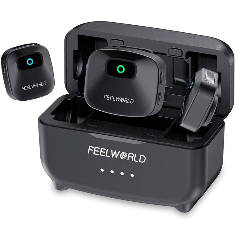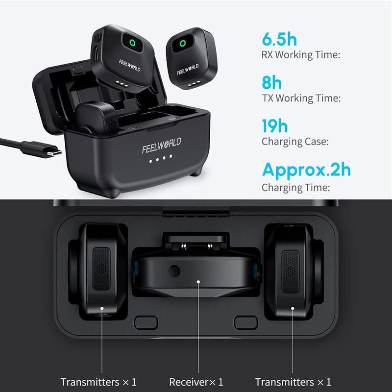 Feelworld LM1 draadloze lavaliermicrofoon met 2 zenders, 1 ontvanger en oplaadcase voor telefoon, camera en pc