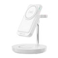 Het 5-in-1 Magnetisch Draadloos Oplaadstation is een veelzijdige en handige oplader waarmee je tot 3 apparaten tegelijk kunt opladen. Dankzij de compatibiliteit met MagSafe en telefoons die draadloos opladen ondersteunen, kun je verschillende modellen apparaten naadloos opladen. De ingebouwde USB-A poort biedt een extra oplaadmogelijkheid. Verder heeft het station een afneembare 5000 mAh powerbank, die zorgt voor onafhankelijkheid en mobiliteit in elke situatie. De powerbank heeft ook een oplaadindicator, ventilatieopeningen voor temperatuurafvoer tijdens draadloos opladen en een USB-C poort voor 20W snel opladen. Daarnaast is de powerbank uitgerust met een praktische voet die dienst doet als standaard tijdens het opladen van de telefoon, wat de functionaliteit ten goede komt.