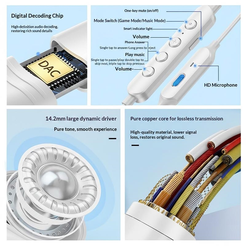 De GC0098 Type-C bedrade oortelefoons zijn ontworpen voor meeslepende gaming en dagelijks muziek luisteren, en combineren krachtige geluidsprestaties met praktische functies voor dagelijks gebruik. Ze zijn uitgerust met een grote dynamische driver van 14,2 mm en een ingebouwde digitale decoderingschip, en leveren helder hifi-stereogeluid met diepe bassen en gedetailleerde hoge tonen. Met dubbele gaming- en muziekmodi, een stabiele Type-C-verbinding en een magnetisch ontwerp om in de knoop raken te voorkomen, zijn deze oortelefoons een betrouwbare keuze voor smartphones, tablets en andere Type-C-apparaten.