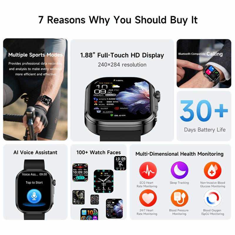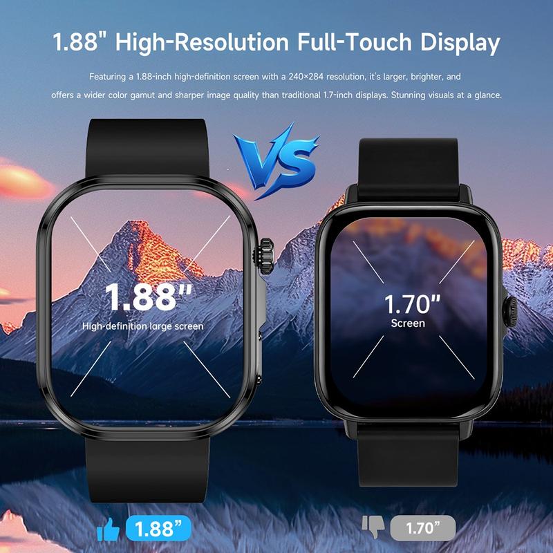 Het GE52 slimme horloge combineert geavanceerde gezondheidsmonitoring met modern gemak en biedt ECG-meting, hartslagmonitoring, bloedzuurstofdetectie, temperatuurmonitoring en meer - alles vanaf uw pols. Het grote 1,88 inch HD-scherm biedt heldere, levendige beelden die traditionele 1,7 inch schermen overtreffen, waardoor het dagelijkse gebruik duidelijker en aangenamer wordt.