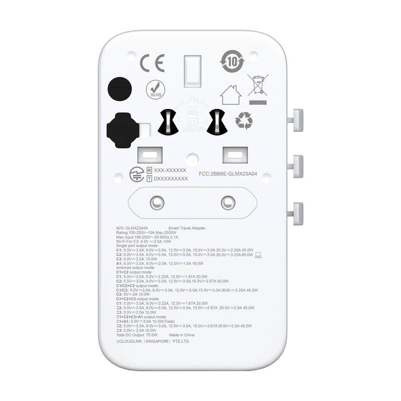 GlocalMe RoamPlug Reisadapter met 4G/LTE Wi-Fi Hotspot - 70W, EU, UK, JP, CN, US, AUS, 3x USB-C, 1x USB-A