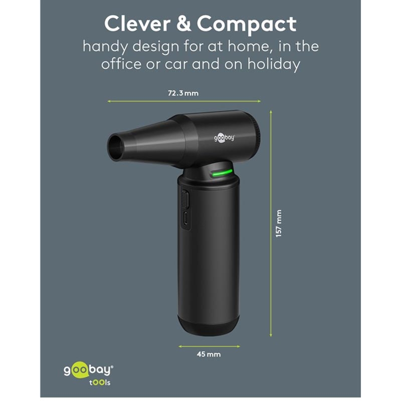 De Goobay Air Duster Superior is het ultieme alternatief voor persluchtbussen. Met een verbazingwekkende 130.000 rpm borstelloze motor en 180 W vermogen, levert het ongeëvenaarde blaaskracht voor het verwijderen van stof, haren van huisdieren en vuil van toetsenborden, PC kasten, auto-interieurs, werkbanken en nog veel meer. Oplaadbaar, snoerloos en duurzaam ontworpen, biedt deze luchtstofzuiger topprestaties thuis, op kantoor of onderweg.