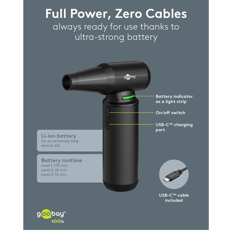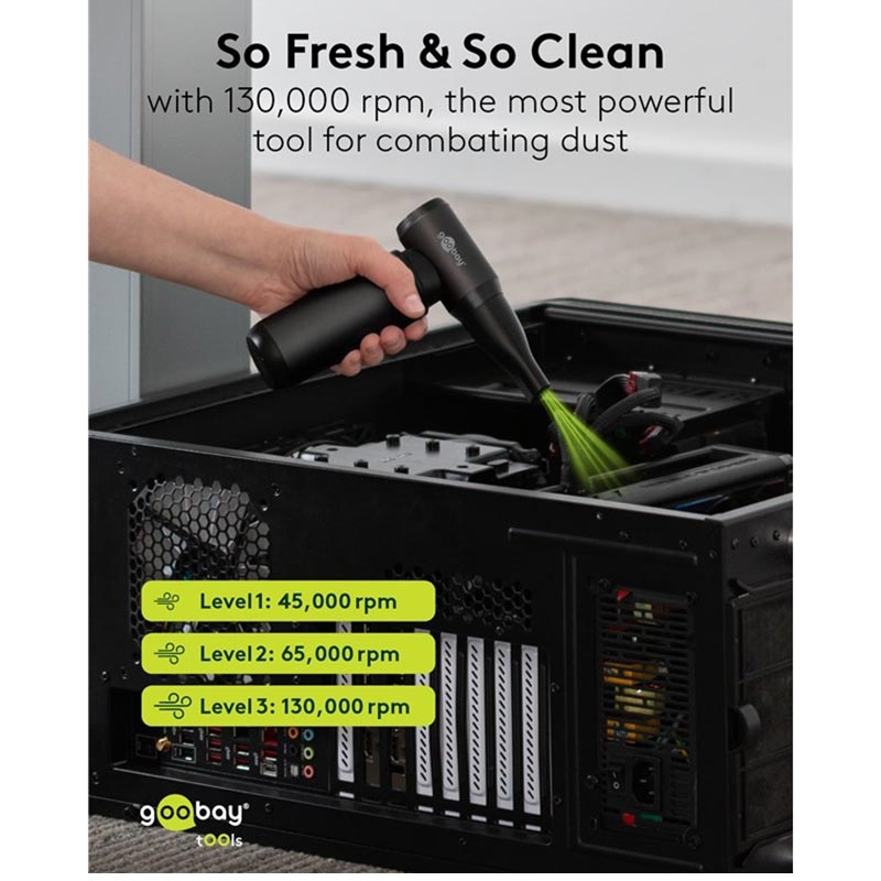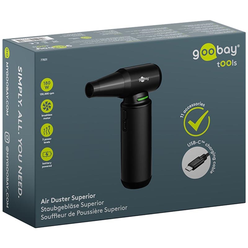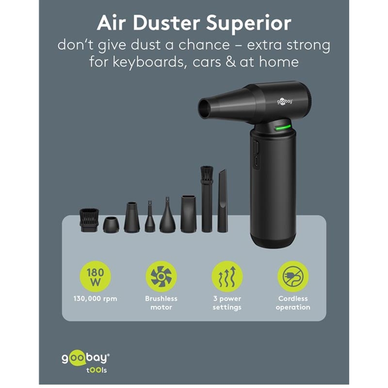 Goobay Luchtstofzuiger Superior - 130000rpm Snoerloze Elektrische Luchtblazer met 8 Mondstukken & 3 Borstels (180 W, Aluminium Ontwerp)