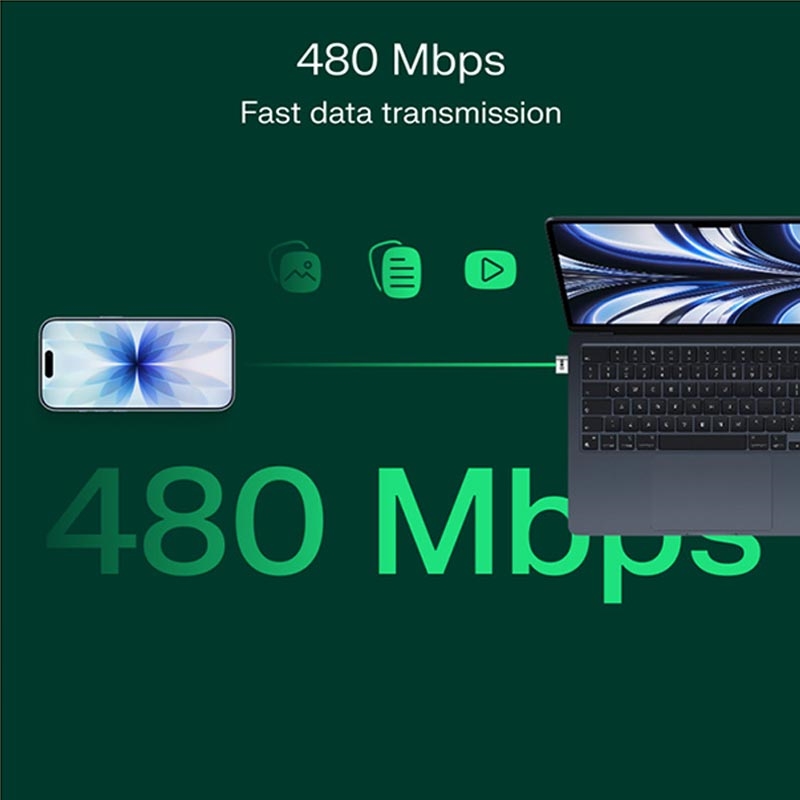 - Snelle gegevensoverdracht - Ondersteunt overdrachtssnelheid van 480Mbps, waardoor snelle en efficiënte bestandsoverdracht mogelijk is tussen apparaten zoals smartphones, tablets en laptops.