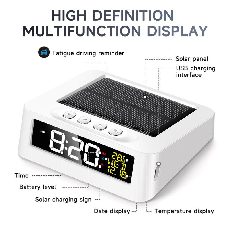 U krijgt een draagbare klok die blijft werken op zonne-energie of USB Type-C-opladen, waardoor hij betrouwbaar is voor thuis en onderweg. De vermoeidheidsherinnering voegt een praktisch veiligheidsvoordeel toe voor bestuurders.