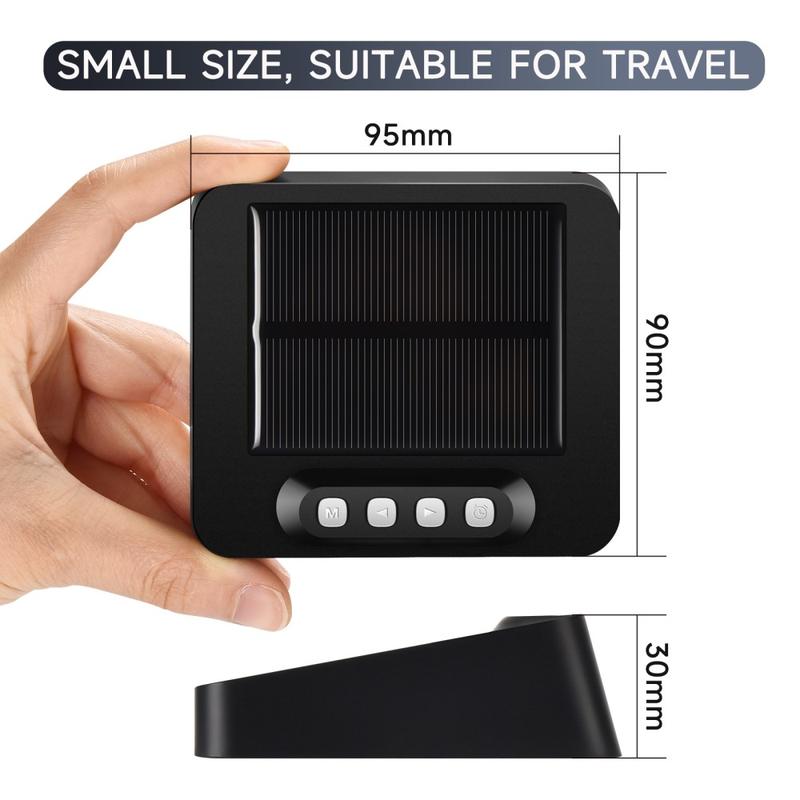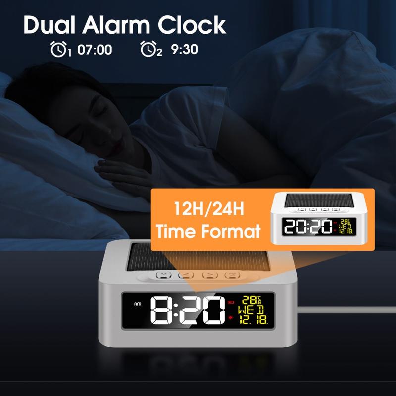 De GS-301 LED-wekker op zonne-energie is een compacte, reisvriendelijke klok die de tijd, datum, weekdag en temperatuur weergeeft op een duidelijk HD-LED-scherm. Hij ondersteunt dubbele stroomvoorziening (opladen via zonne-energie plus opladen via USB Type-C) voor betrouwbaar gebruik in verschillende omgevingen, van de auto tot het nachtkastje of de camping. Met dubbele alarmen, 12/24-uursformaat, een snooze-functie van 5 minuten en een ingebouwde vermoeidheidswaarschuwing tijdens het rijden, is het een slimme keuze voor dagelijkse routines en lange reizen.