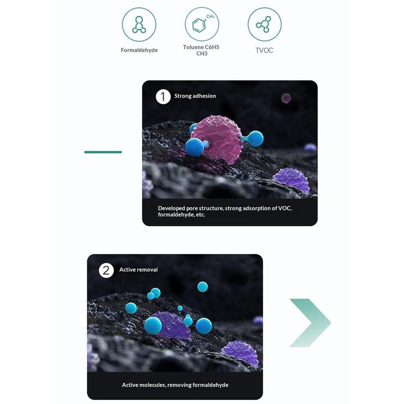 - Katalytische actieve kool helpt bij het absorberen van formaldehyde, tolueen en TVOC-verbindingen