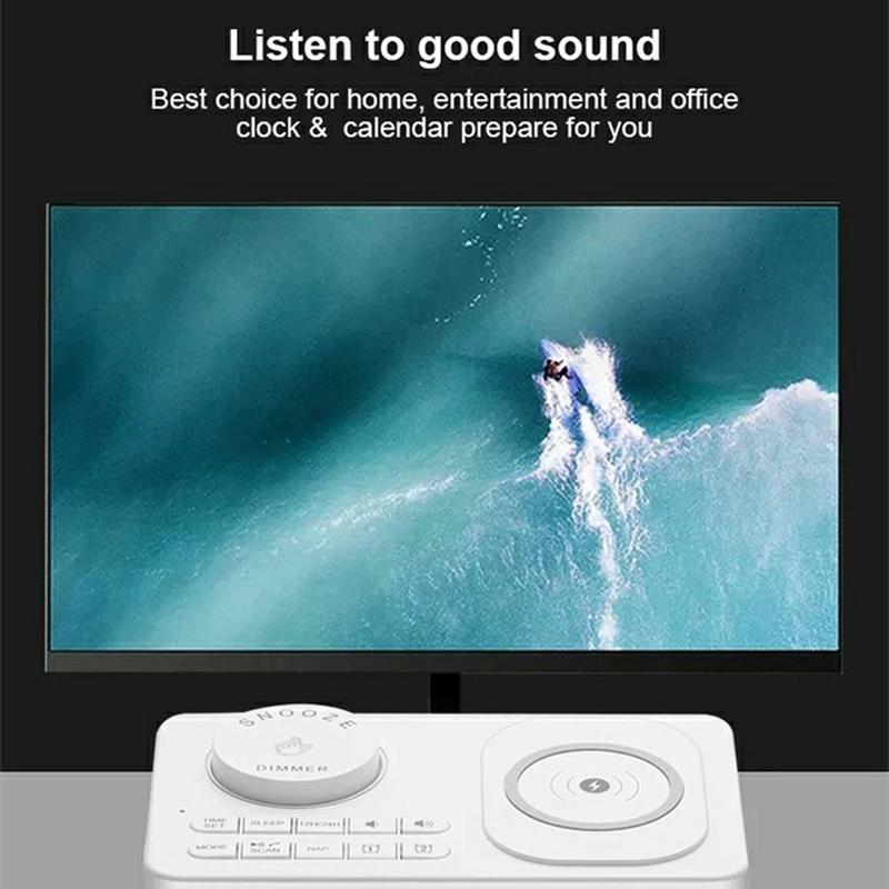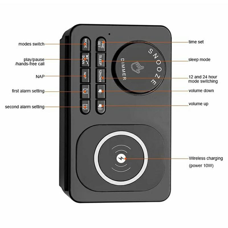 - Metgezel naast het bed: Wakker worden met je favoriete FM-radiozender of een geselecteerd USB-muzieknummer, met je smartphone volledig opgeladen op de draadloze pad.