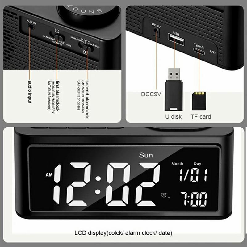 - Aanpasbaar dubbel alarm: Stel twee afzonderlijke alarmen in met de keuze uit ingebouwde ringtones, FM-radio of USB-muziekweergave. Inclusief een alarminstelling voor alleen weekdagen voor optimaal gemak.