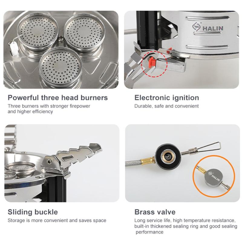 Het Halin Outdoor Roestvrijstalen Draagbare Gasfornuis is een duurzame en handige kookoplossing voor buitenactiviteiten. De elektronische ontsteking zorgt voor een veilige en gemakkelijke manier om het fornuis te starten, terwijl de schuifgesp zorgt voor handige opslag en ruimtebesparing. De messing klep zorgt voor een lange levensduur en hoge temperatuurbestendigheid, met een ingebouwde verdikte afdichtingsring voor goede afdichtingsprestaties. Met een vermogen van 11800W en een kooktijd van ongeveer 2-3 minuten is dit fornuis een efficiënte en betrouwbare keuze voor buiten koken.