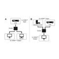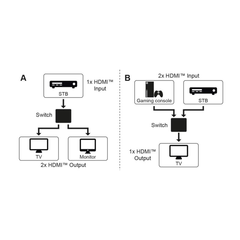 Dubbele HDMI™-schakelaar voor het aansturen van 1x HDMI™-ingangssignaal tot 2x HDMI™-enheter, t.ex. mogelijk, of alternatief 2x ingångssignaler tot 1x terminal. HDMI™-distributeur 2-in-1 die geschikt is voor 3D en upplösning tot 4K @ 30 Hz en HDCP-compatibel, heeft één of twee verschillende weergaven. U kunt kiezen uit HDMI™-switches om de pantoffelkop aan te sluiten op kabel- en skyddar-aansluitingen. Lamplig t.ex. voor blu-ray-spelers, satelliet-/tv-zenders, datorer, surfplattor, spelconsole voor PS4 of Xbox tot tv-apparaat, monitor of projector, HDMI™-switchbox 2x1 werkt rechtstreeks via de aangesloten HDMI™-poorten met een externe verbinding. Observera: HDMI™-schakelaars zijn geïntegreerd in een splitter!