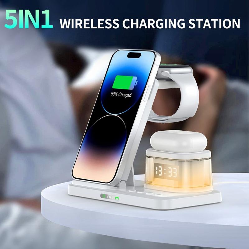 - 5-in-1 multifunctioneel oplaadstation - Laadt je smartphone, smartwatch en oortelefoon draadloos op, terwijl het ook werkt als nachtlampje en compacte opberger.