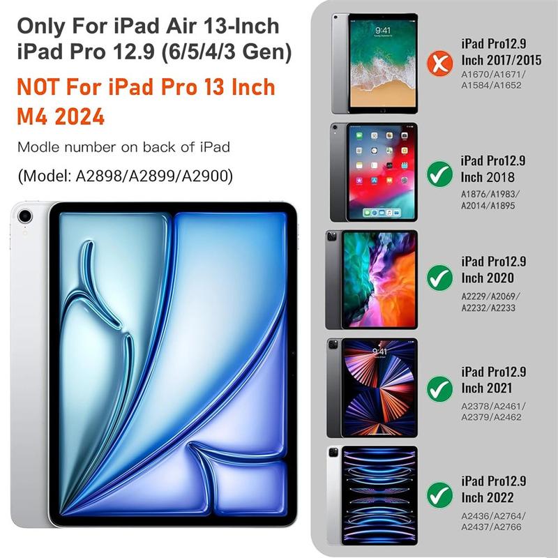 Verfraai je iPad Air 13 2026/2025/2024, iPad Pro 12.9 2022/2021/2020/2018 met de Bluetooth toetsenbordhoes, een multifunctioneel 2-in-1 accessoire dat bescherming, productiviteit en stijl combineert. Deze slanke hoes is gemaakt van eersteklas polyurethaan en biedt volledige bescherming tegen krassen, schokken en vingerafdrukken met behoud van een professionele uitstraling. Het Bluetooth-toetsenbord maakt draadloos verbinding voor vloeiend, responsief typen, terwijl het geïntegreerde touchpad multi-gesture controle ondersteunt voor moeiteloze navigatie. Dankzij het toetsenbord met achtergrondverlichting kunt u zelfs in omgevingen met weinig licht comfortabel typen. De ingebouwde verstelbare standaard biedt een ergonomische kijkhoek, waardoor het perfect is voor typen, streamen of lezen. Deze toetsenbordhoes is ontworpen voor zakelijk, reis- of dagelijks gebruik en verandert je tablet in een draagbaar werkstation.