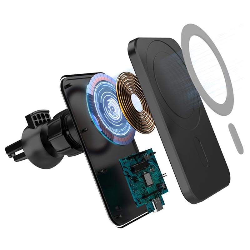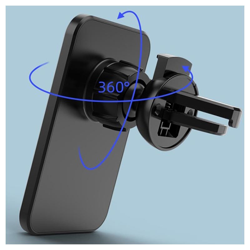Deze autohouder met ventilatierooster voor je iPhone 12/13/14/15/16/17/Air-model is uitgerust met een draadloze oplaadfunctie, zodat je onderweg nooit zonder stroom komt te zitten. De draadloze oplader biedt laadvermogen tot 15 W, met een stabiel stroom- en temperatuurniveau voor veilig en betrouwbaar opladen. De sterke magnetische ring die in de houder is ingebouwd, houdt je iPhone 12/13/14/15/16/17/Air-smartphone stevig op zijn plaats, zelfs op hobbelige wegen. Dankzij de ontluchterbevestiging met een 360 graden draaiknop blijft je smartphone in een perfecte kijkpositie.