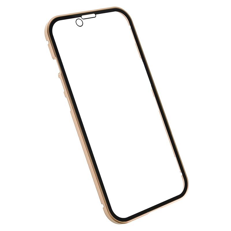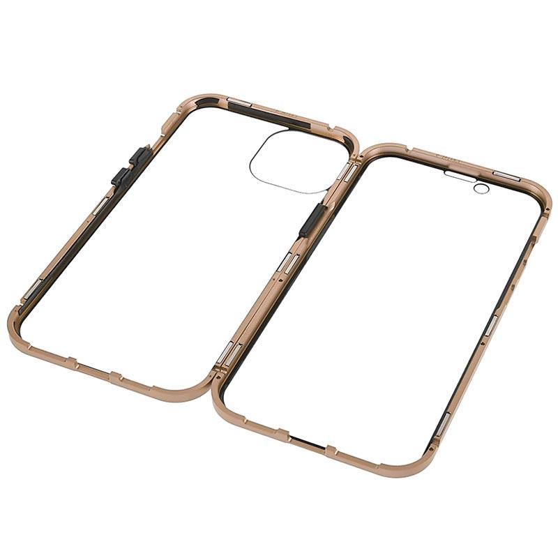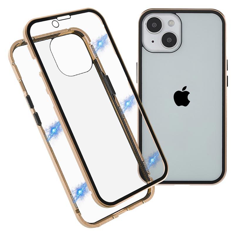 - iPhone 14 hoesje met een metalen frame en gehard glas voor voor- en achterkant