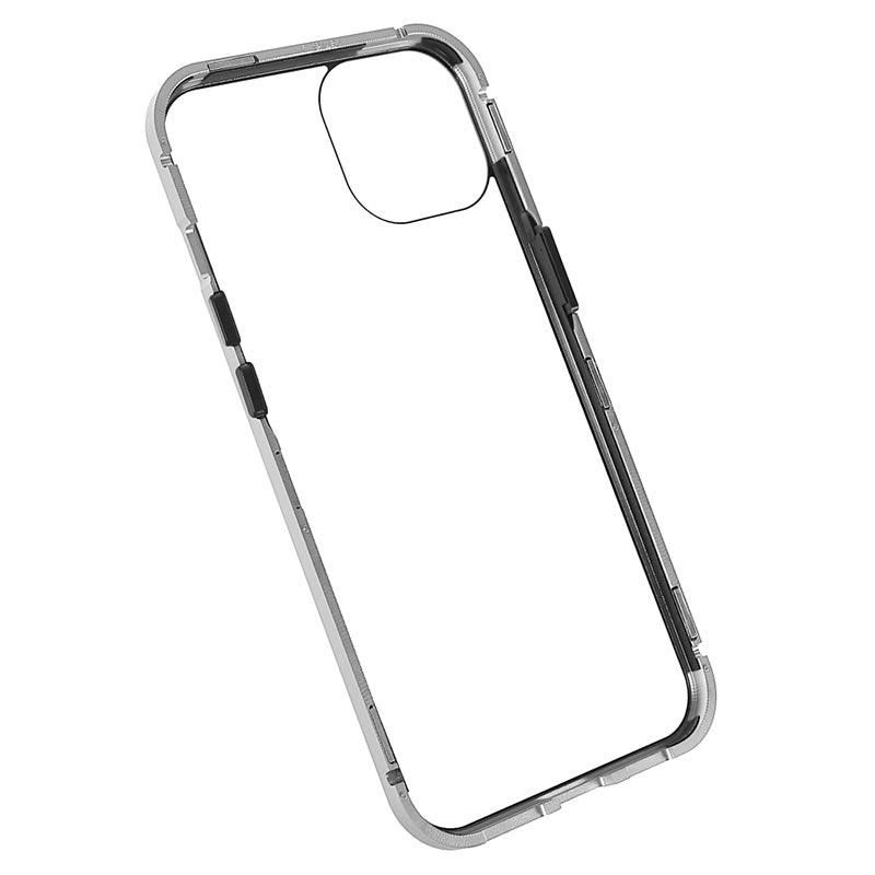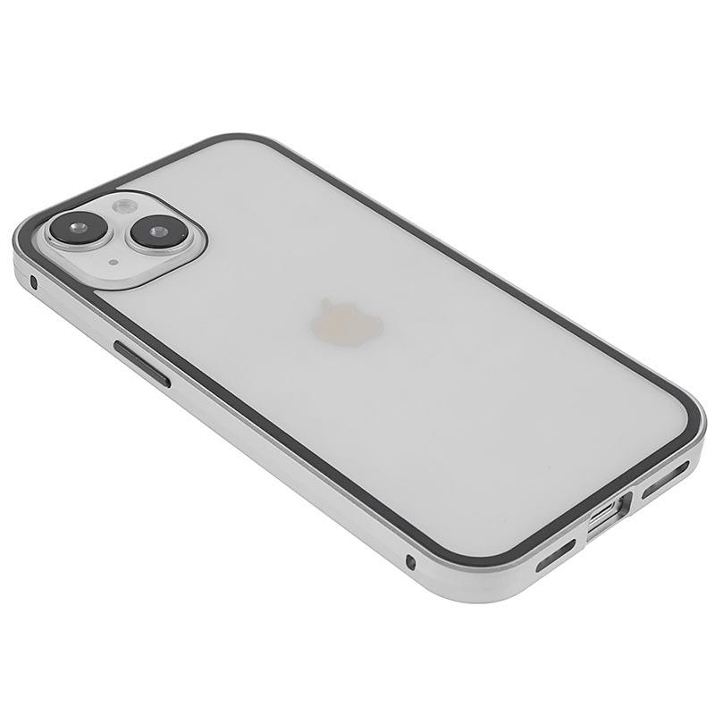 - iPhone 14 hoesje met een metalen frame en gehard glas voor voor- en achterkant
