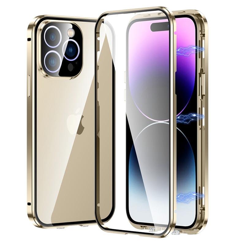 - iPhone 14 Pro Max hoesje met een metalen frame en gehard glas voor voor- en achterkant