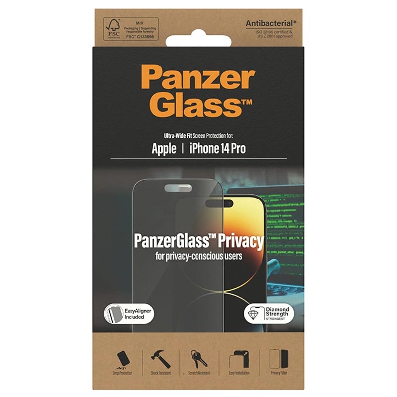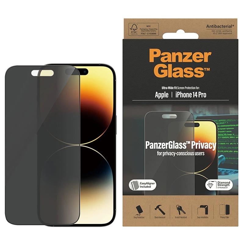 PanzerGlass Ultra-Wide Fit Privacy EasyAligner AntiBacterial Glazen Screenprotector voor iPhone 14 Pro