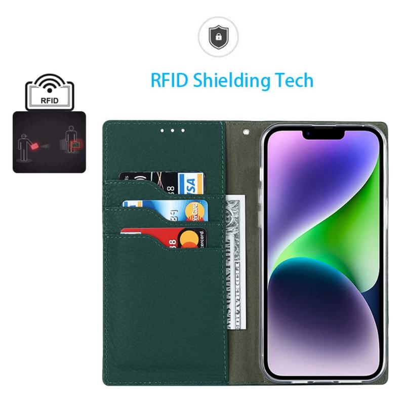 Voor iPhone 14 RFID Blokkerende Kaartsleuf Portemonnee Telefoon Case Litchi Textuur Lederen Stand Auto-geabsorbeerde Beschermhoes: