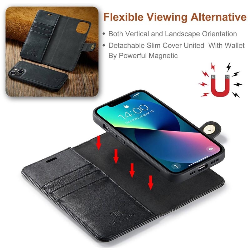 DG.Ming 2-in-1 portemonnee voor iPhone 15 is een veelzijdige case die bescherming biedt en functionaliteit toevoegt. De portemonnee bestaat uit twee afzonderlijke hoesjes die bij elkaar worden gehouden door magneten: een zachte, gespleten leren folio met vakken en een hoes met kliksluiting voor de iPhone 15. Dankzij de magnetische sluitingen kan hij worden omgevormd tot een standaard voor het gemakkelijk bekijken van media.