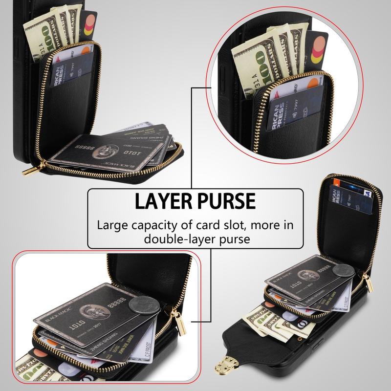 Draag je telefoon, pasjes en geld in één gestroomlijnd accessoire met deze portemonneehoes met rits voor iPhone 15 Plus. Gemaakt van duurzaam TPU gecoat in eersteklas polyurethaan leer, biedt hij alledaagse bescherming en vervangt hij de noodzaak van een aparte portemonnee. Perfect voor wie stijl, gemak en veiligheid in één wil.