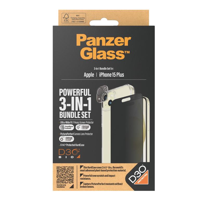 PanzerGlass Privacy 3-in-1-pakket voor iPhone 15 Plus - HardCase Cover, PicturePerfect Camera Lens Protector, Ultra-Wide Fit Privacy Screen Protector