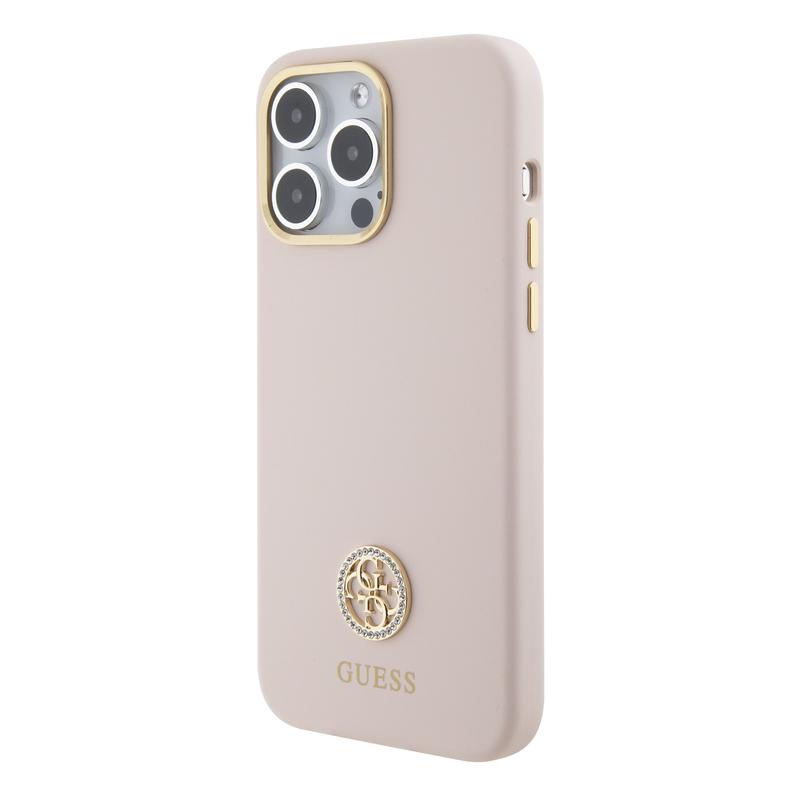 Guess 4G Strass Metal Logo Liquid Silicone Hoesje voor iPhone 15 Pro Max