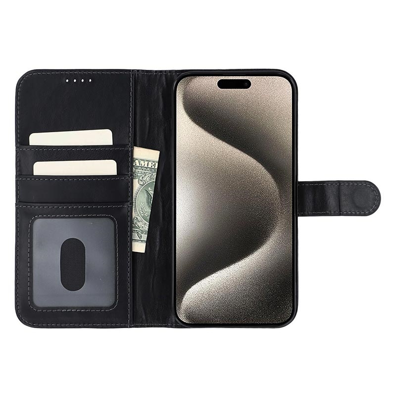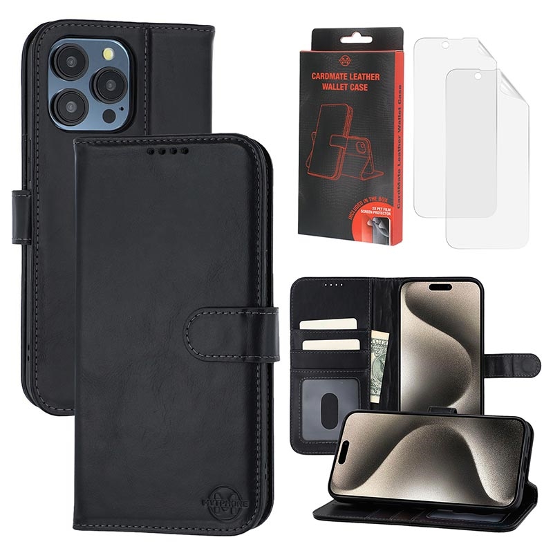 MyTPhone CardMate Premium Lederen Portemonnee Hoesje voor iPhone 15 Pro - Stand Functie, Kaarthouder, Draadloos Opladen Ondersteuning, 2x Screen Protector