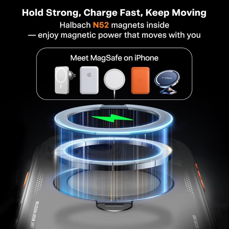 Dankzij de Halbach Array-technologie met hoogwaardige N52SH neodymiummagneten levert de hoes tot 200% sterkere magnetische kracht. Dit zorgt voor betrouwbaar bevestigen en opladen met alle MagSafe-accessoires.